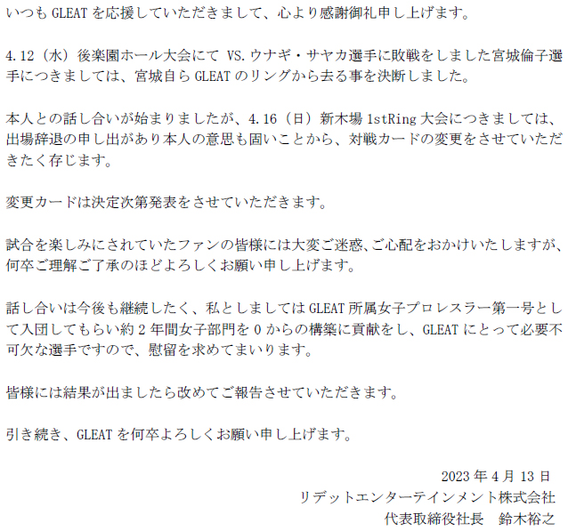 【4.16 新木場1stRing大会 宮城倫子選手欠場のお知らせ】