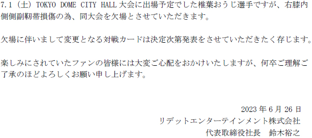 【7.1 TDCH大会 椎葉おうじ選手欠場のお知らせ】
