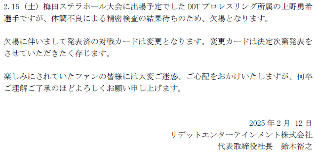 【2.15梅田ステラホール大会 上野勇希選手 欠場のお知らせ】
