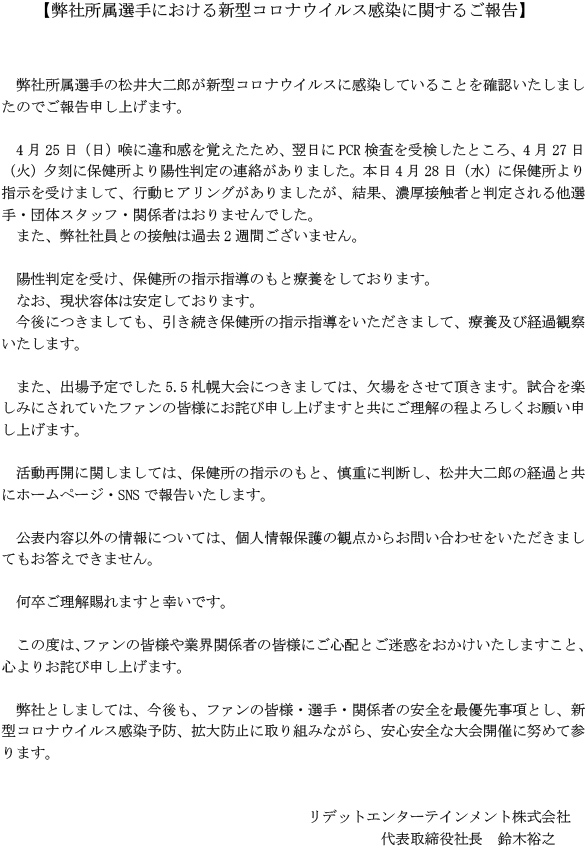 【弊社所属選手における新型コロナウイルス感染に関するご報告】