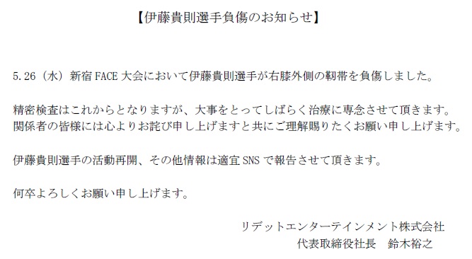 【 伊藤貴則選手 負傷のお知らせ 】
