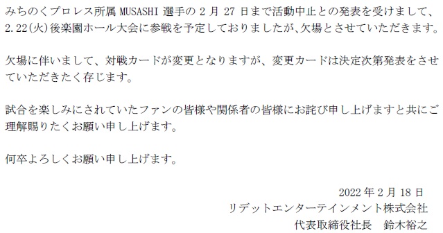 【MUSASHI選手欠場のお知らせ】