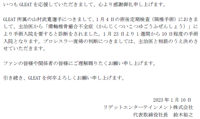 【山村武寛選手についてお知らせ】