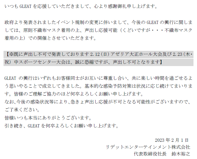 不織布マスク着用の上、声出し応援について