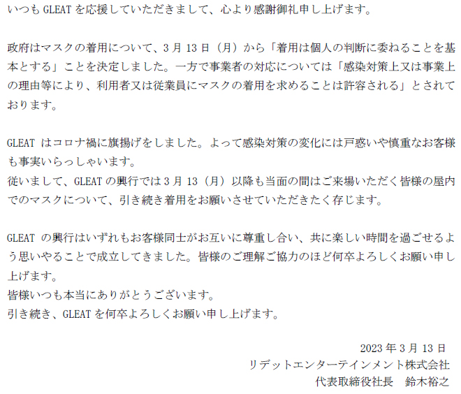 3月13日(月)以降のご来場者様のマスク着用ルールについて